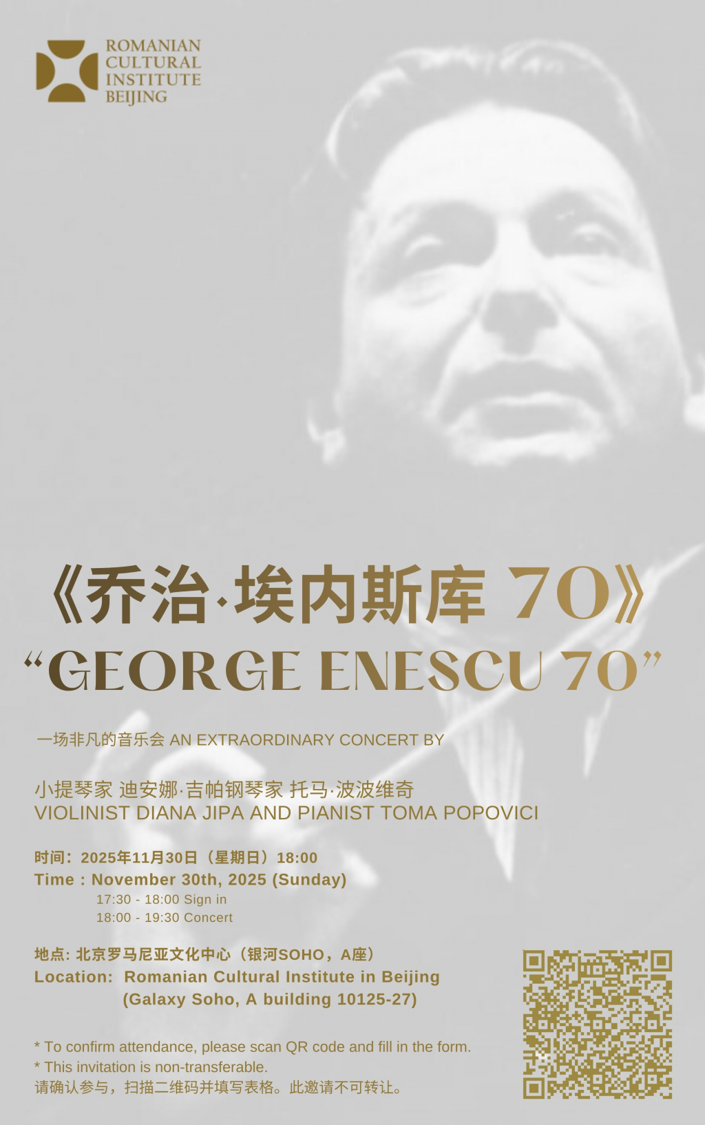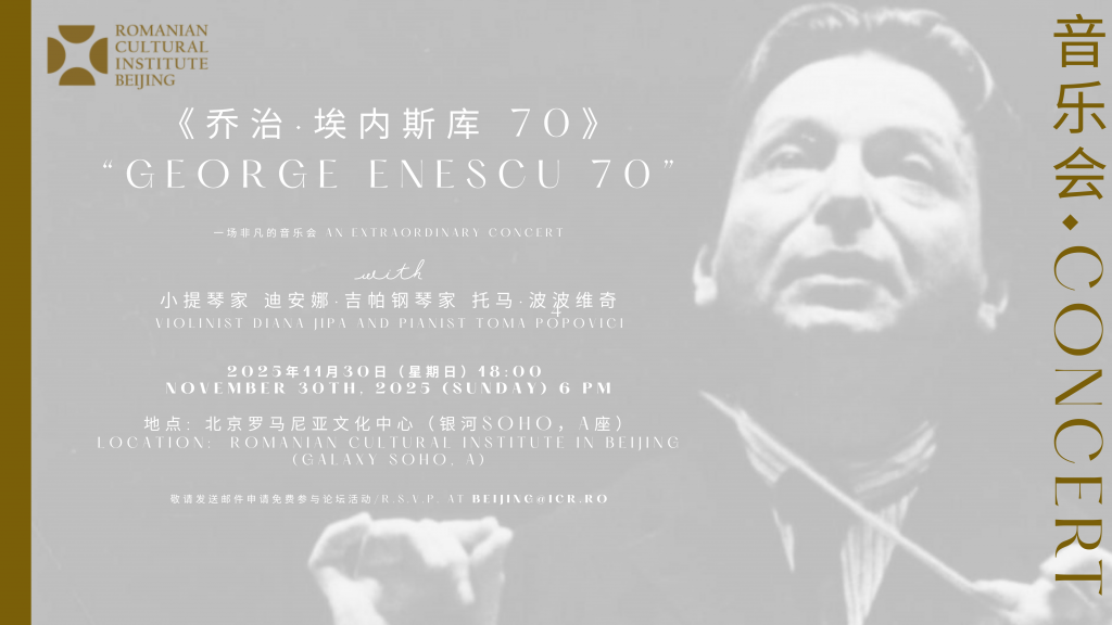 Institutul Cultural Român de la Beijing are deosebita onoare de a vă invita la concertul extraordinar „George Enescu ’70”, susținut de violonista Diana Jipa și pianistul Toma Popovici, care va avea loc duminică, 30 noiembrie 2025, ora 18:00, la sediul ICR Beijing din Galaxy SOHO. Evenimentul este organizat cu prilejul Zilei Sfântului Andrei și în ajunul Zilei Naționale a României, în memoria celui mai mare compozitor român, George Enescu, de la a cărui trecere în eternitate se împlinesc 70 de ani.