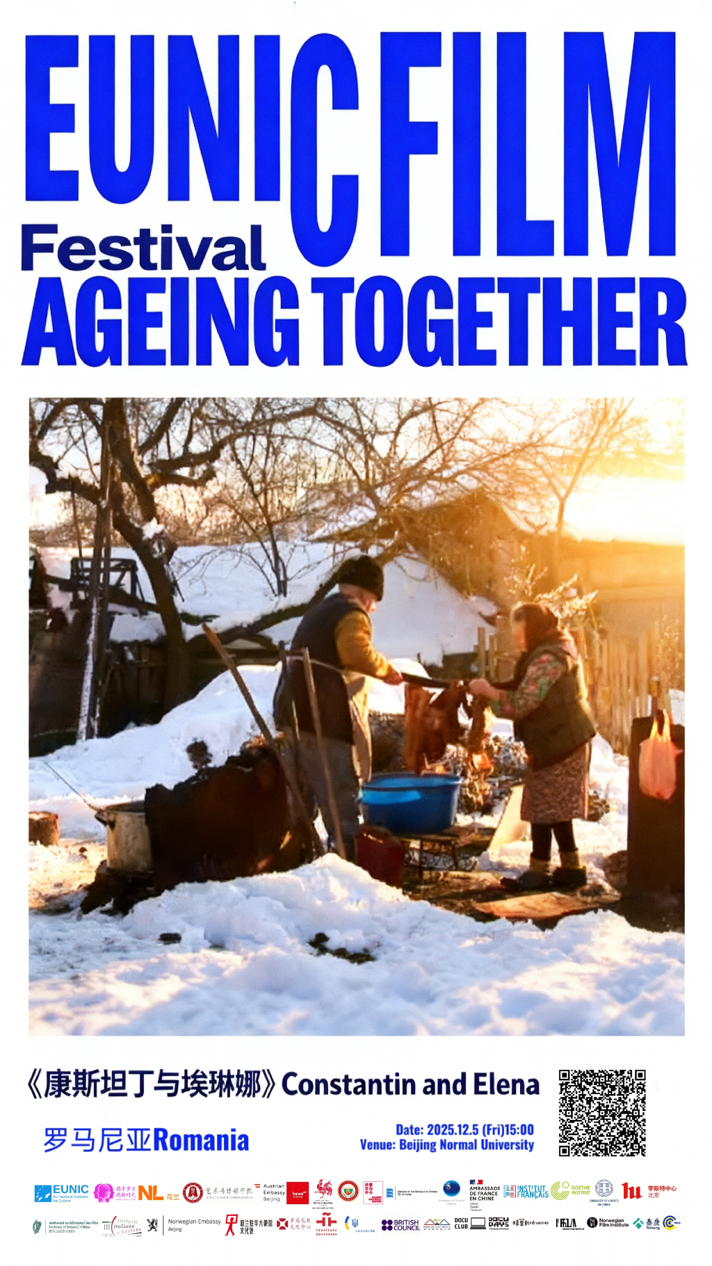 The screening of the film “Constantin and Elena” will take place on 29 November 2025, at 19:00 at the Romanian Cultural Institute in Beijing (Galaxy SOHO), and on 5 December 2025, at 15:00, at Beijing Normal University. Entry is free, based on registration, by scanning the QR code on the poster.