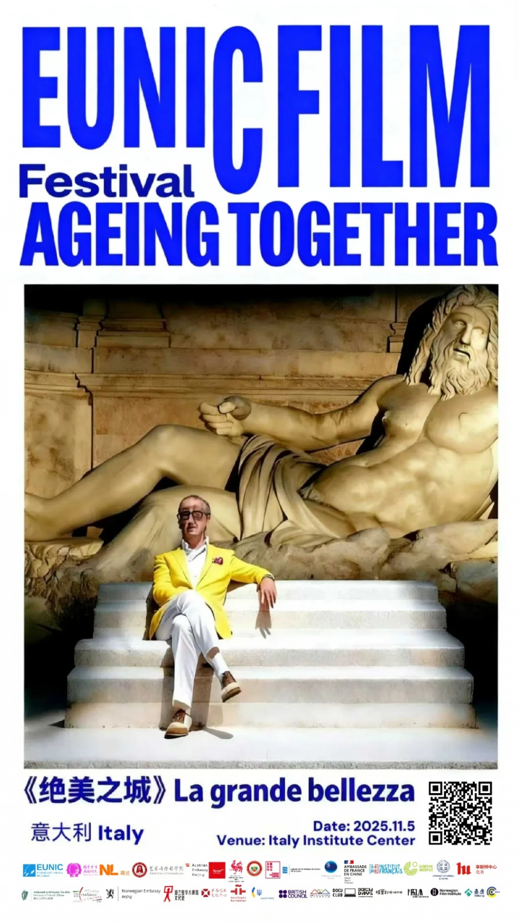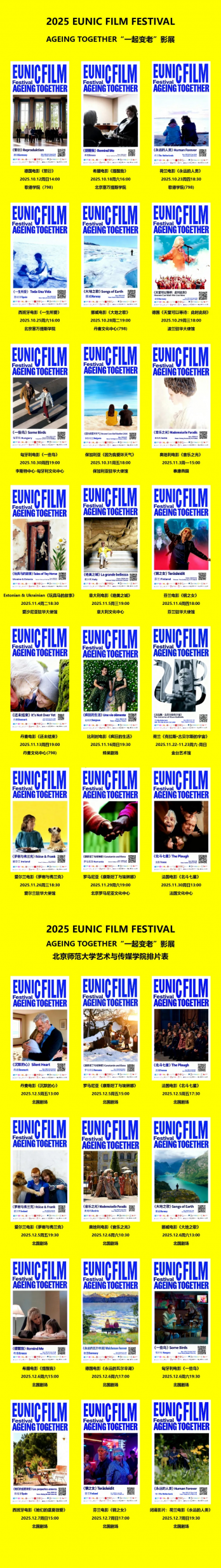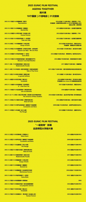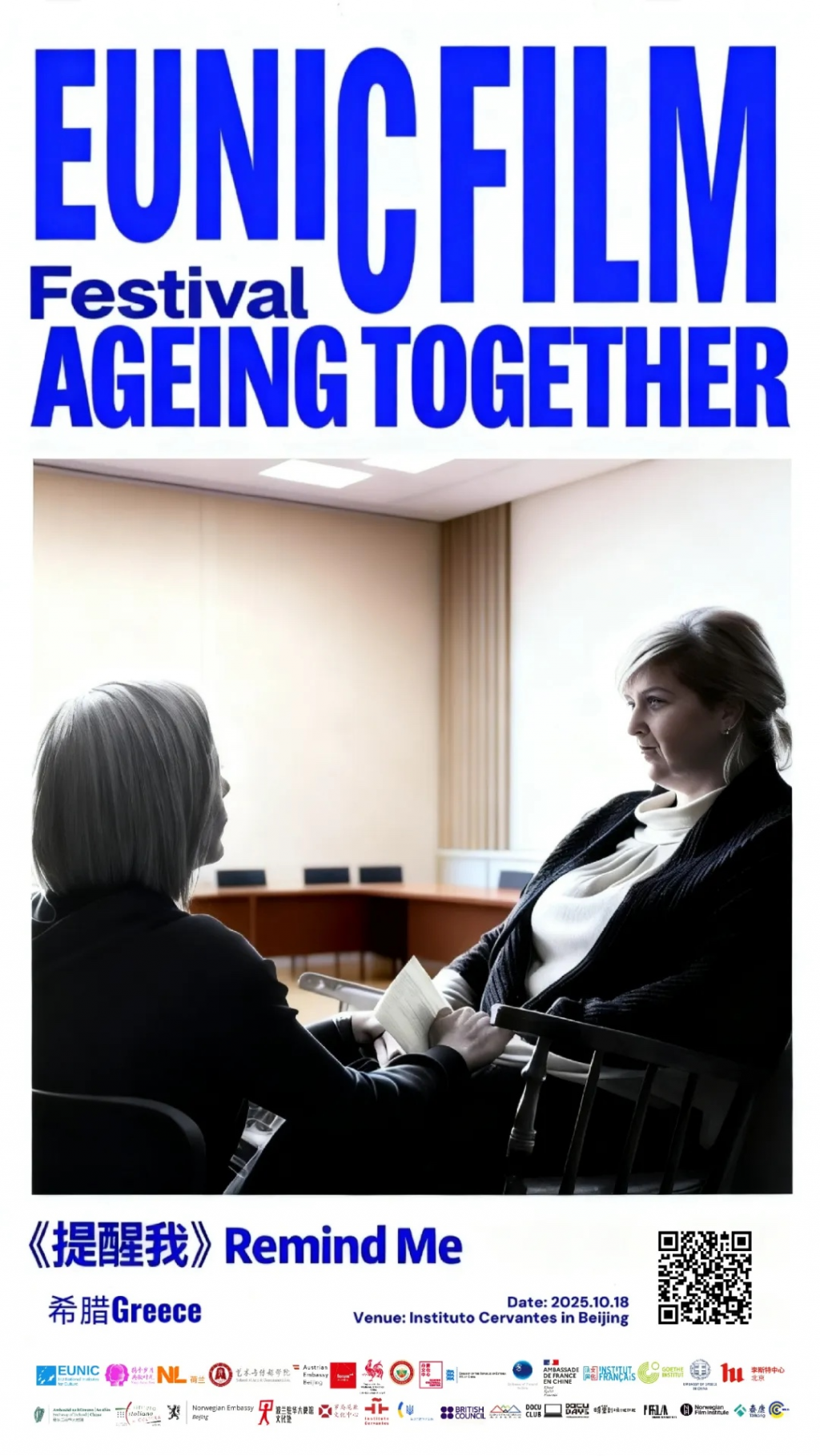 Between 12 October and 7 December 2025, ICR Beijing has the great pleasure to present the second edition of the EUNIC China Film Festival, a landmark cinematographic event included in the 2025 EUNIC-funded project “Ageing Together · Voices across Time.” This year’s edition explores the intergenerational dynamic and the social implications of a world in which ageing is becoming an increasingly visible phenomenon, offering the Chinese public a selection of 21 films and 30 screenings, presented in various cultural venues in Beijing. The event is organized by EUNIC China (the Network of the National Cultural Institutes of the European Union in China), in partnership with 19 European institutes and embassies (Romania, Italy, Greece, Austria, Wallonia-Brussels, Denmark, Finland, Germany, the Netherlands, France, Hungary, Spain, the United Kingdom, Ireland, Bulgaria, Ukraine, Poland and Estonia), and with the support of the EUNIC Cluster Fund.