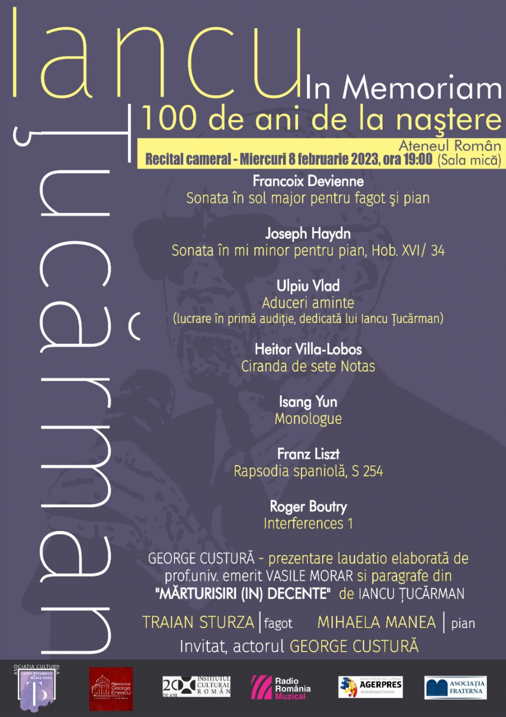 Asociația culturală „Iancu ȚUCĂRMAN și Maria POPA“, în parteneriat cu Institutul Cultural Român, organizează un recital In Memoriam Iancu Țucărman, 100 de ani de la naștere. Evenimentul va avea loc miercuri, 8 februarie 2023, ora 19.00, la Sala Mică a Ateneului Român din București.
