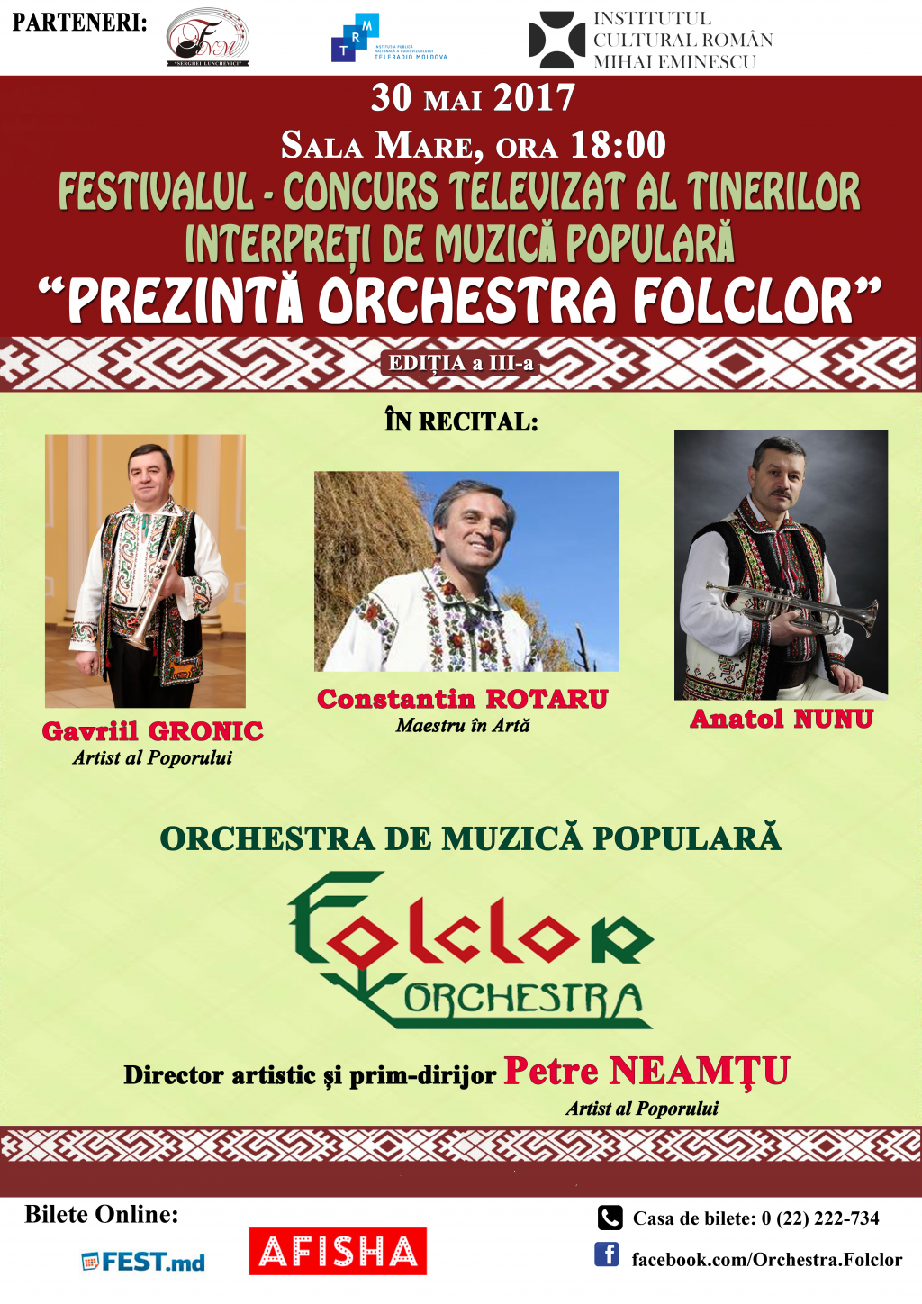 Filarmonica Națională „Serghei Lunchevici” în colaborare cu Orchestra de muzică populară „FOLCLOR” şi Compania Publică TeleRadio Moldova, în parteneriat cu Institutul Cultural Român „Mihai Eminescu” la Chişinău organizează a doua etapă a Festivalului – Concurs Televizat Pentru Tinerii Interpreţi de Muzică Populară „Prezintă Orchestra FOLCLOR”. Evenimentul se va desfăşura pe data de 30 mai, 2017 la Filarmonica Naţională „Serghei Lunchievici” din Chişinău.