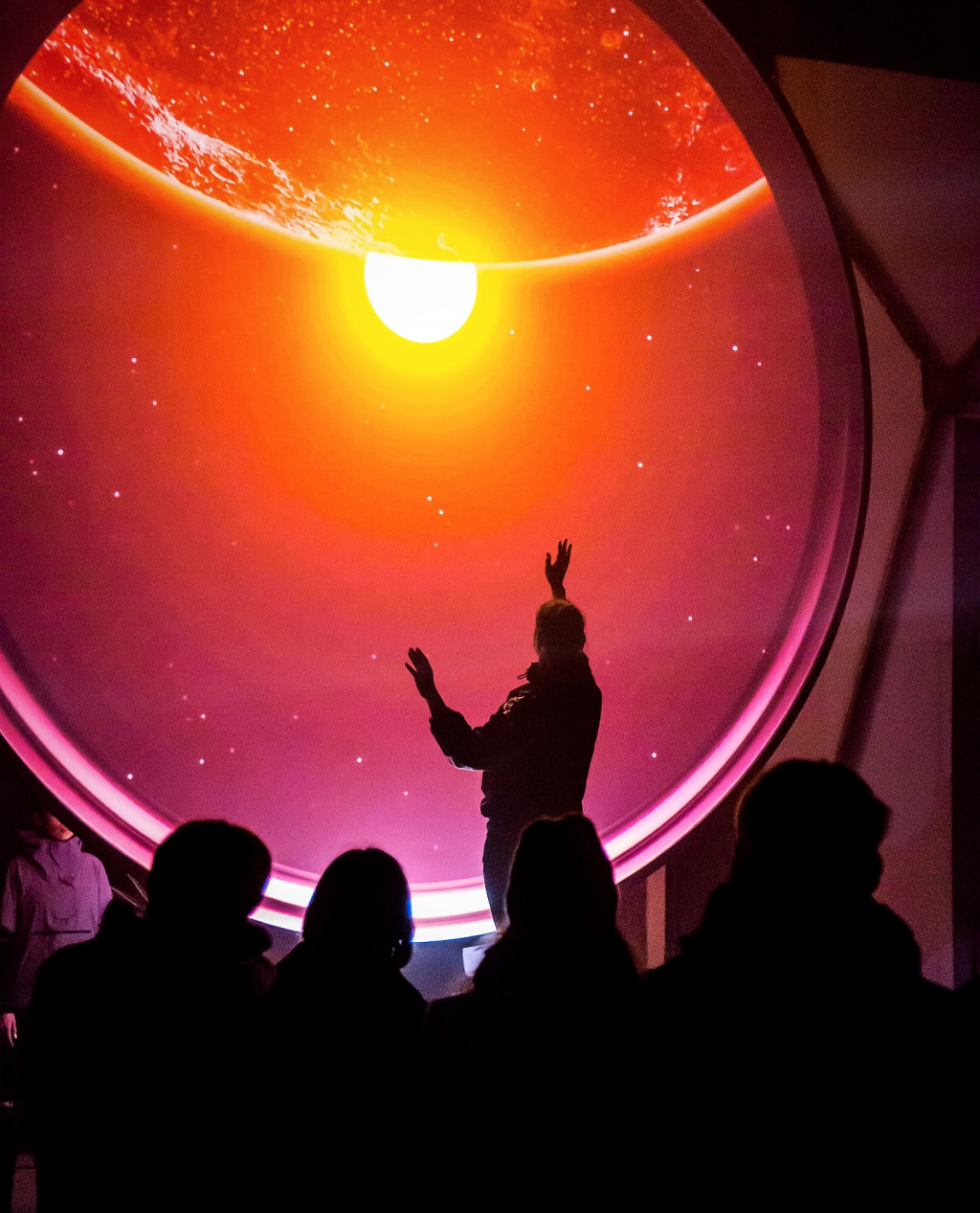 Sol Machina-Instalație audiovizualăcareexplorează legătura profundă dintre energia solară și experiența umană. Instalația reprezintă un motor eteric, o "mașină" care transformă energia abstractă a soarelui într-o forță tangibilă și emoțională.Forma centrală a acestei instalații luminoase creează o iluzie hipnotică a unui vortex sau a unui nucleu energetic. Aranjamentul elementelor se referă la coroana solară, aureola luminoasă, furtunile solare și energia care alimentează întregul sistem solar și viața de pe Pământ.