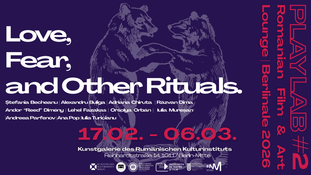 Gleichzeitig präsentiert Playlab #2 unter dem Titel „Love, Fear, and Other Rituals“ filmische Arbeiten und künstlerische Positionen junger rumänischer Kreativen: Jugendliche zwischen Verlust und Freiheit, Klangperformances, die gemeinschaftliche Rituale aus rumänischen Dörfern neu interpretieren, erinnerungswürdige Orte, prähistorische Wesen auf Partnersuche oder ein Schneckenpaar, das Zärtlichkeit neu definiert. Film, Animation, Dokumentarisches und bildende Kunst treten in Dialog und eröffnen neue Erfahrungsräume.