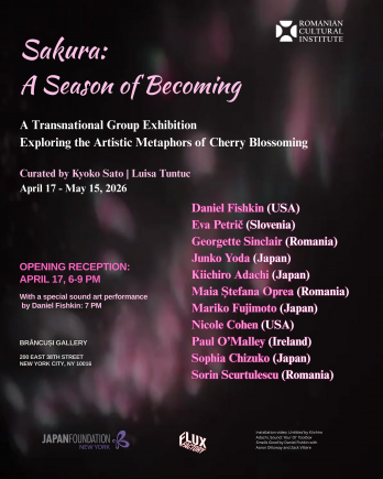 Institutul Cultural Român de la New York organizează vineri, 17 aprilie 2026, vernisajul expoziției internaționale „Sakura: A Season of Becoming” („Sakura: un anotimp al devenirii”), un dialog intercultural între România și Japonia, mediat de spiritul cosmopolit