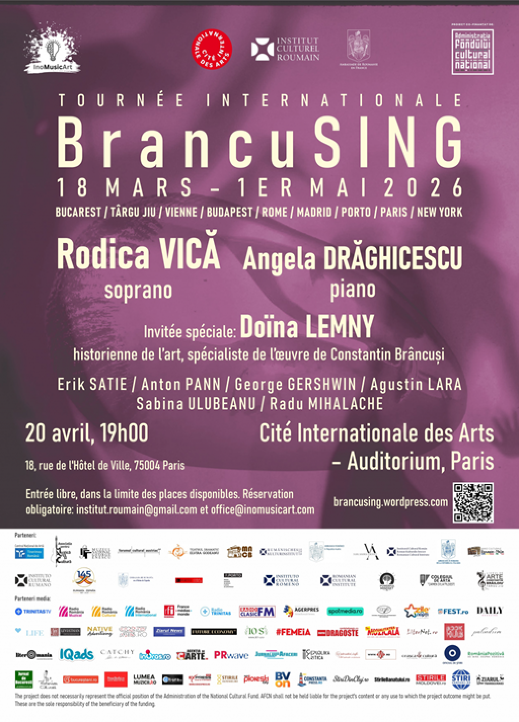 Un nou recital din cadrul turneului internațional „BrancuSING“ va avea loc luni, 20 aprilie 2026, de la ora 19.00, la Cité internationale des arts din Paris, cu participarea sopranei Rodica Vică, a pianistei Angela Drăghicescu, alături de Doina Lemny – istoric de artă, cercetător specializat în opera lui Constantin Brâncuși, invitată în calitate de moderator și expert.