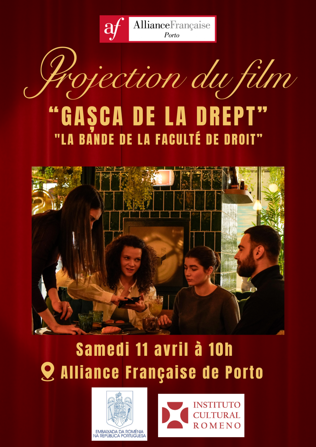 ICR Lisabona, în colaborare cu Ambasada României la Lisabona și Alianța Franceză din Porto, prezintă proiecția filmului românesc „Gașca de la Drept”(2025), în regia Mihaelei Aniței, în cadrul Festivalului de film francofon, ocazionat de sărbătorirea Francofoniei în Portugalia. Proiecția va avea loc la sediul Alianței Franceze din Porto (Rua de Santa Isabel 88, 4050-536), în data de 11 aprilie 2026, ora 10:00.