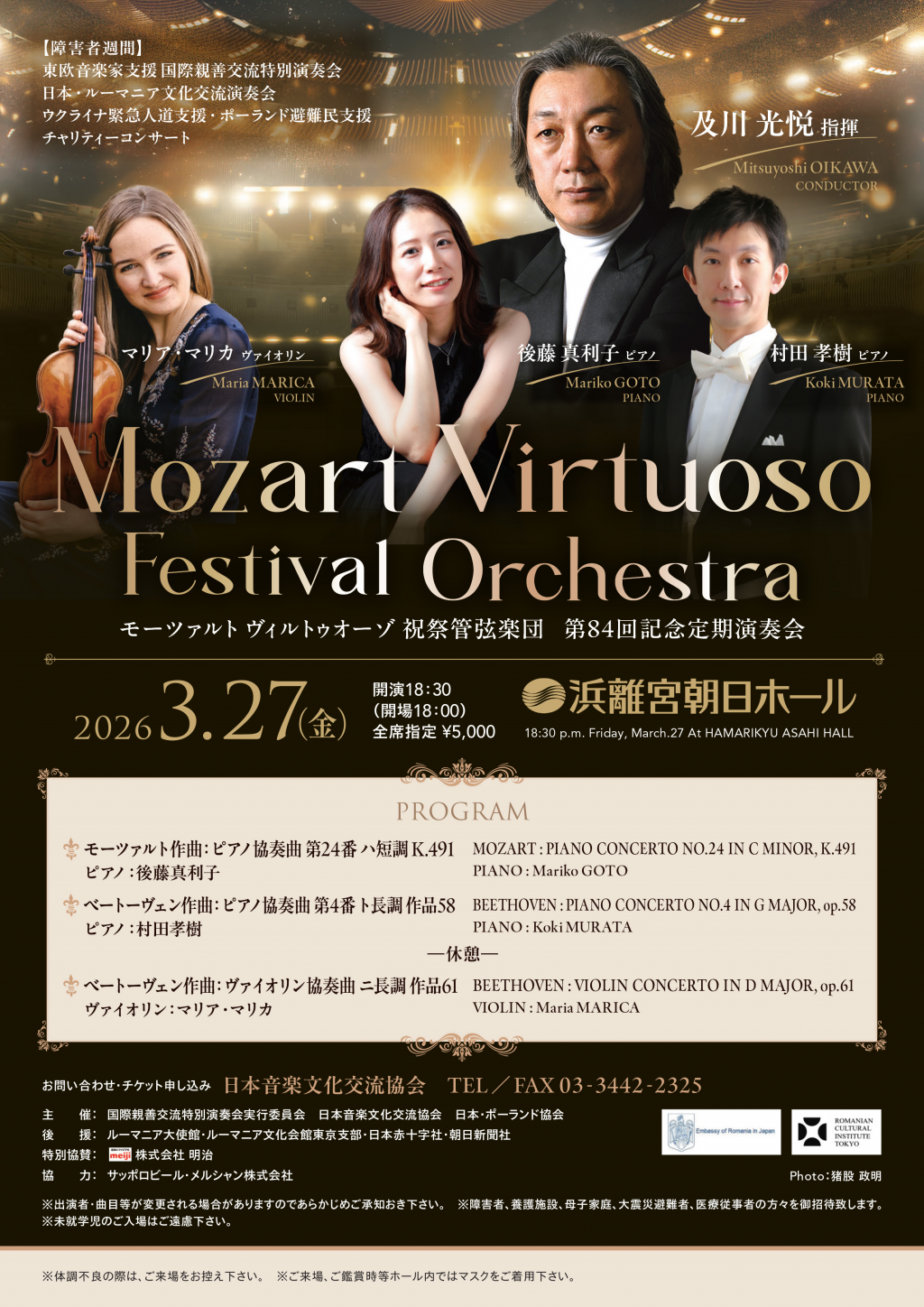 Orchestra internațională Virtuoso Mozart Festival este alcătuită din tineri muzicieni talentați din țările din estul Europei. În program: Ludwig van Beethoven – Concertul pentru vioară și orchestră în D majorop. 61 – solistă Maria Marica, Ludwig van Beethoven – Concertul nr. 4 pentru pian și orchestră op. 58 – solistă Murakami Kouki, Wolfgang Amadeus Mozart – Concertul nr. 24 pentru pian și orchestră K 218 - solistă Goto Mariko.