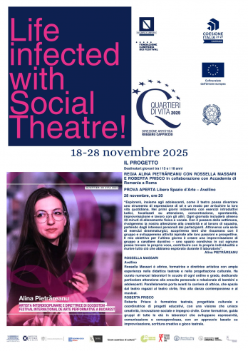 QUARTIERI DI VITA – LIFE INFECTED WITH SOCIAL THEATRE 17 novembre-1 dicembre 2024Il progetto di teatro sociale “Quartieri di Vita. LIFE INFECTED WITH SOCIAL THEATRE!” riunisce artisti internazionali e membri svantaggiati delle comunità locali del Sud Italia,