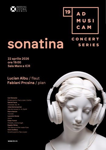 Institutul Cultural Român vă invită miercuri, 22 aprilie 2026, de la ora 19:00, în Sala Mare, la un nou eveniment al stagiunii camerale AdMusicam Concert Series - Sonatina, un recital de flaut și pian susținut de Lucian Albu și Fabiani Prcsina. Programul