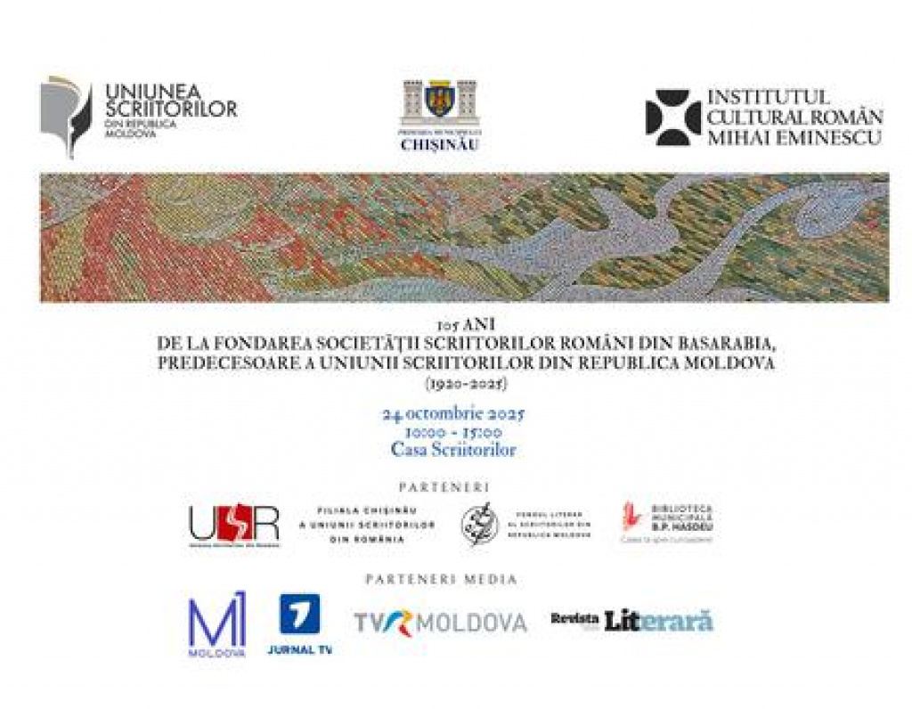 Institutul Cultural Român „Mihai Eminescu” la Chișinău susține evenimentul aniversar dedicat împlinirii a 105 ani de la fondarea Societății Scriitorilor Români din Basarabia, predecesoare a Uniunii Scriitorilor din Republica Moldova (1920-2025), care va avea loc în data de 24 octombrie 2025, începând cu ora10:00, în Holul cu oglinzi al Casei Scriitorilor.
