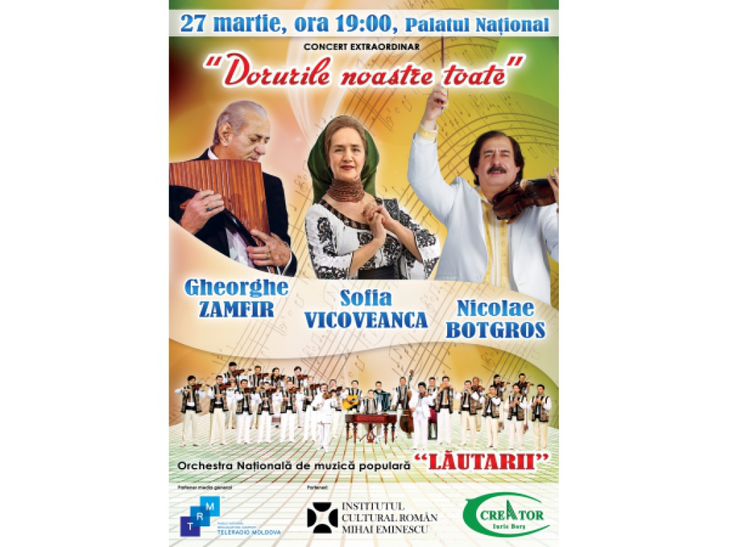 Institutul Cultural Român „Mihai Eminescu” la Chișinău în parteneriat cu Compania Publică TeleRadio Moldova organizează, pe data de 27 martie 2015, ora 19.00, la Palatul Naţional, concertul extraordinar de muzică populară „Dorurile noastre toate”.