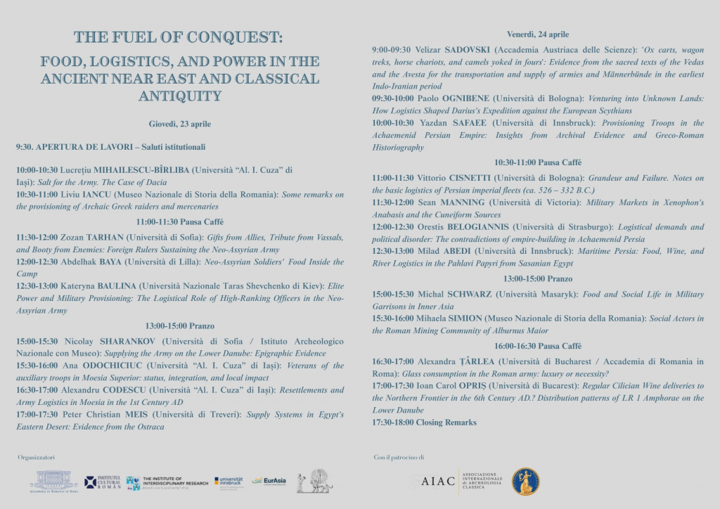 Accademia di Romania in Roma, în colaborare cu Universitatea Alexandru Ioan Cuza din Iași – Institutul de Cercetări Interdisciplinare, Centrul Arheoinvest (http://arheoinvest.uaic.ro/), Universitatea Innsbruck și Melammu Project, organizează, în zilele de 23 și 24 aprilie 2026,sub patronajul Asociației Internaționale de Arheologie Clasică, al Academiei Române și cu sprijinul Institutul Cultural Român,conferința internațională „The Fuel of Conquest: Food, Logistics, and Power in the Ancient Near East and Classical Antiquity”.