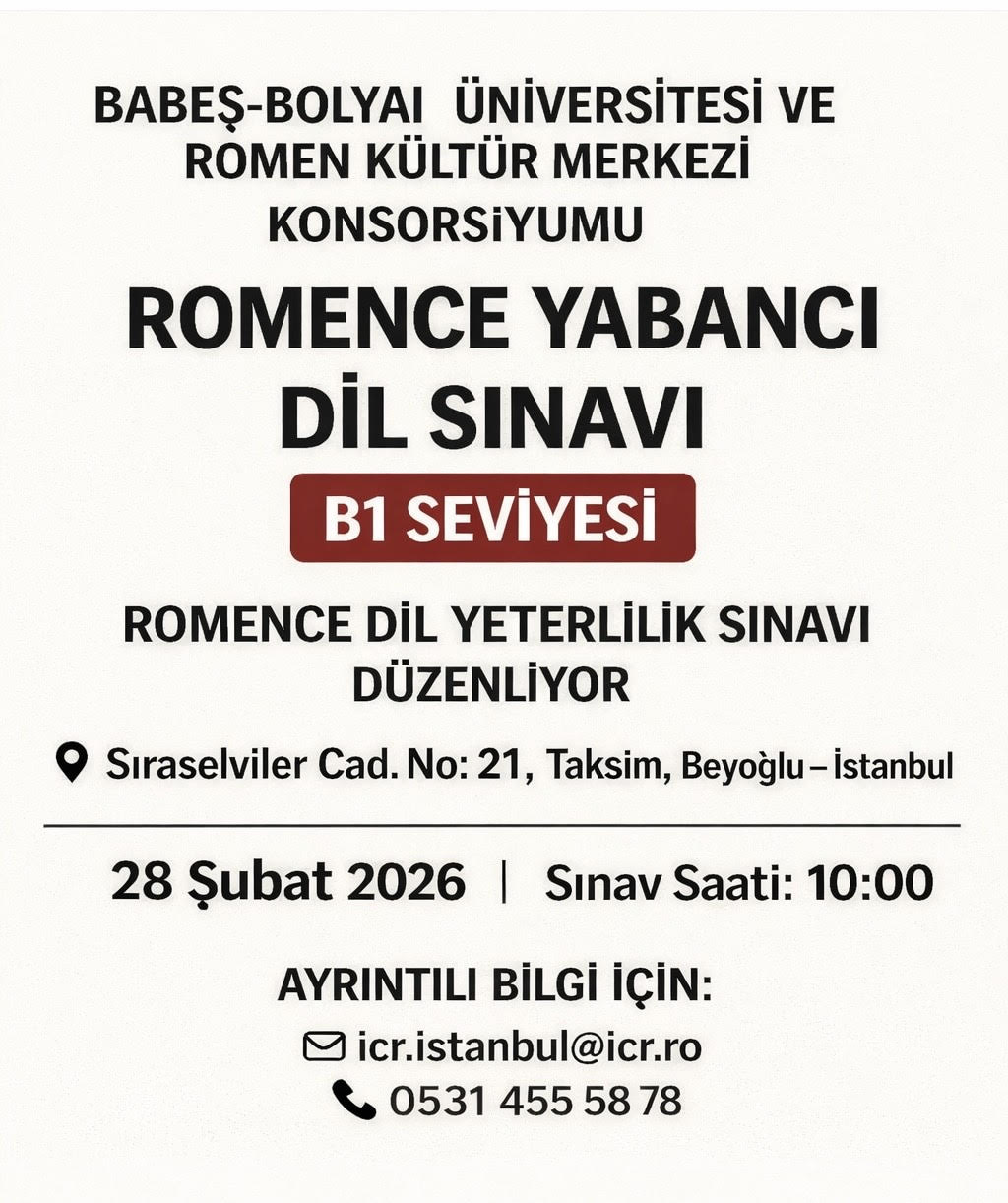 SINAV YERİ : Sıraselviler Cad., no. 21, Taksim, Beyoğlu - İstanbul adresteki İSTANBUL “DİMİTRİE CANTEMİR” ROMEN KÜLTÜR MERKEZİ’NDE