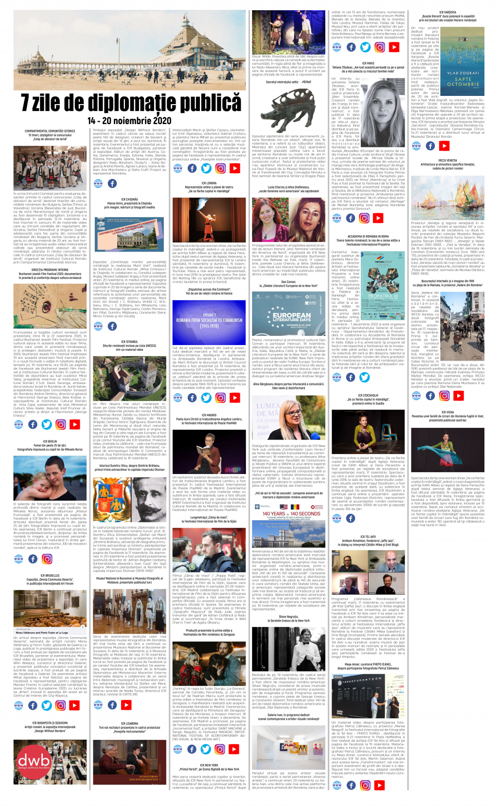 Urmăriți în documentul atașat activitatea echipei Institutului Cultural Român de promovare a culturii și civilizației românești în străinătate și în țară, în perioada 14-20 noiembrie 2020.