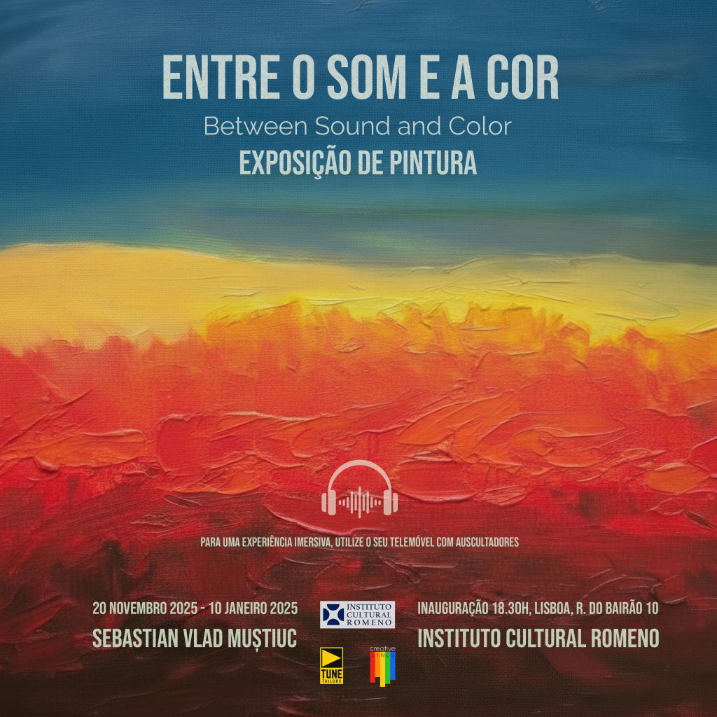 ICR Lisabona găzduiește în perioada 20 noiembrie 2025 – 10 ianuarie 2026 expoziția „Între muzică și culoare” a artistului Sebastian Vlad Muștiuc. Expoziția va fi vernisată în data de 20 noiembrie 2025 începând cu ora 18:30 la sediul ICR Lisabona, Rua do Barao 10.