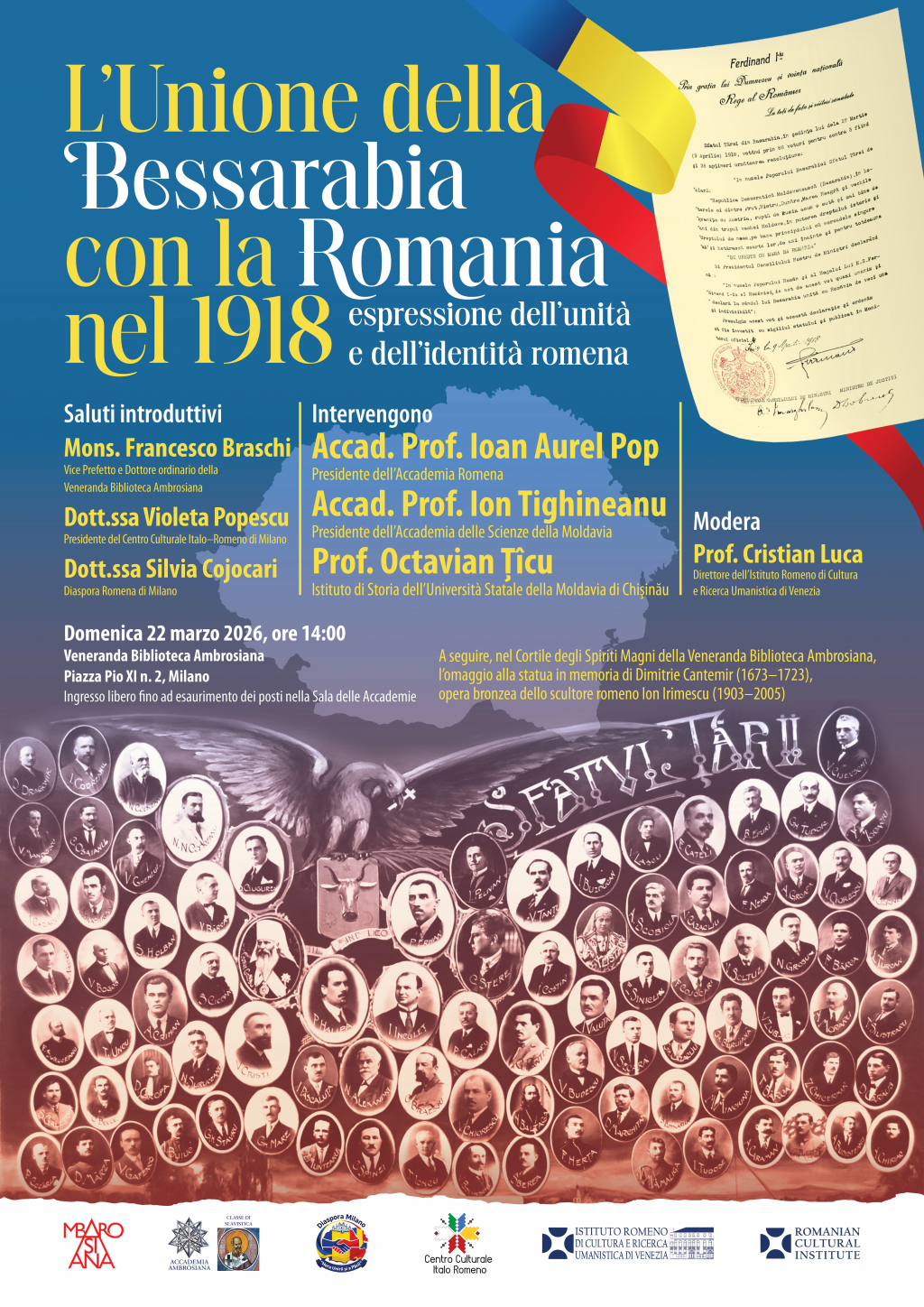 Simpozionul „Unirea Basarabiei cu România în 1918, expresie a unităţii şi identităţii românilor”, prilejuit de marcarea momentului istoric al Unirii Basarabiei cu România (27 martie 1918), va avea loc duminică, 22 martie 2026, începând cu ora 14:00, în Sala delle Accademie a Bibliotecii Ambrosiana din Milano. Manifestarea cultural–ştiinţifică este organizată de diaspora română din Milano, Centrul Cultural Italo–Român din Milano şi Institutul Român de Cultură şi Cercetare Umanistică de la Veneţia, în colaborare cu Biblioteca Ambrosiana. În cadrul simpozionului, vor susţine alocuţiuni cu privire la evenimentele din anului 1918, situaţia Basarabiei în contextul istoric al Unirii cu România, în martie 1918, şi importanţa Unirii ca prim pas întreprins pentru desăvârşirea României Mari, invitaţi de seamă, cărturari cu reputaţie internaţională aflaţi la conducerea celor mai înalte foruri ştiinţifice şi culturale din România şi Republica Moldova: Acad. Prof. univ. dr. Ioan Aurel Pop, Preşedintele Academiei Române; Acad. Prof. univ. dr. Ion Tighineanu, Preşedintele Academiei de Ştiinţe a Moldovei; precum şi cunoscutul istoric Conf. univ. dr. Octavian Ţîcu, de la Institutul de Istorie al Universităţii de Stat din Moldova de la Chişinău. În deschiderea manifestării cultural–ştiinţifice, vor susţine un cuvânt de salut: Monseniorul Francesco Braschi, viceprefect al Bibliotecii Ambrosiana; Dr. Violeta Popescu, preşedintele Centrului Cultural Italo–Român din Milano şi doamna Silvia Cojocari, reprezentantă a diasporei române din Milano. Lucrările simpozionului vor fi moderate de Prof. univ. dr. Cristian Luca, directorul Institutului Român de Cultură şi Cercetare Umanistică de la Veneţia.