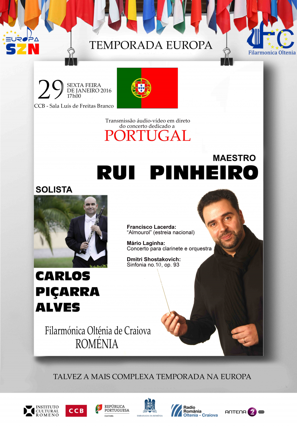 În cadrul proiectului "Stagiunea Europa", ICR Lisabona va asigura transmisiunea directă a concertului dedicat Portugaliei, în data de 29 ianuarie, ora 17.00, la Centrul Cultural din Belém, sala Luís de Freitas Branco. Invitații speciali ai acestui concert sunt dirijorul Rui Pinheiro și solistul Carlos Piçarra Alves (clarinet).