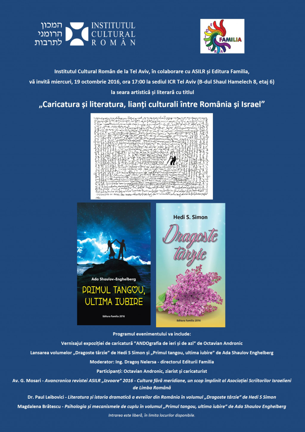 Institutul Cultural Român de la Tel Aviv, în colaborare cu Asociația Scriitorilor Israelieni de Limbă Română și Editura Familia, vă invită la seara artistică și literară cu titlul „Caricatura și literatura, lianți culturali între România și Israel".