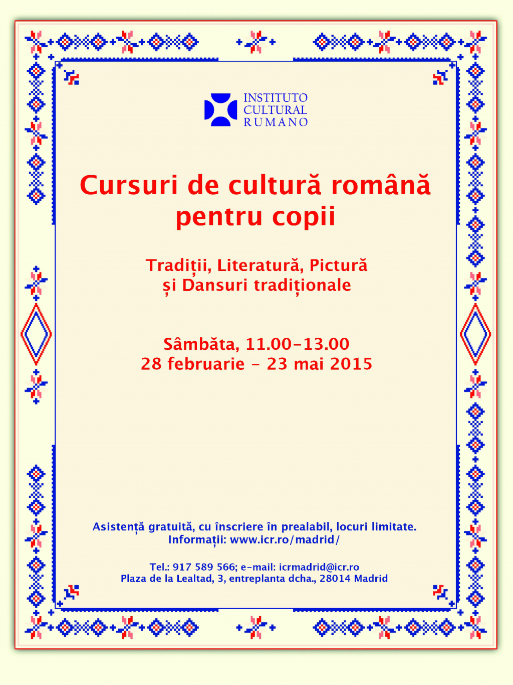 În perioada 28 februarie - 23 mai 2015, Institutul Cultural Român de la Madrid organizează Cursuri de cultură română la Madrid dedicate copiilor cu vârste cuprinse între 7 și 12 ani, vorbitori de limba română. Întâlnirile vor avea loc sâmbăta la sediul ICR Madrid, între orele 11 și 13. Fiecare curs va fi structurat în două părți: una teoretică, urmată de o parte practică, iar temele abordate vor fi: tradiții, literatură, pictură și dansuri tradiționale. Asistență gratuită, cu înscriere în prealabil.