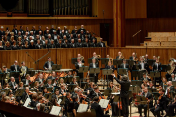 Vladimir Jurowski ridicand partitura enesciana in fata publicul, la premiera britanica a,,Simfoniei a III-a a lui George Enescu la Southbank Centru, cu Orchestra Filarmonicii Londoneze