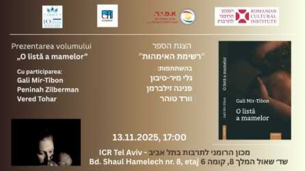 Institutul Cultural Român de la Tel Aviv va organiza, în data de 13 noiembrie 2025, de la ora 17:00, prezentarea volumului „O listă a mamelor” de Gali Mir-Tibon. Apărută în 2017 în limba ebraică, cartea a fost tradusă în română și publicată la Editura Hasefer, în anul 2025, în parteneriat cu Fundația Tarbut Sighet Cultură și Educație Iudaică.