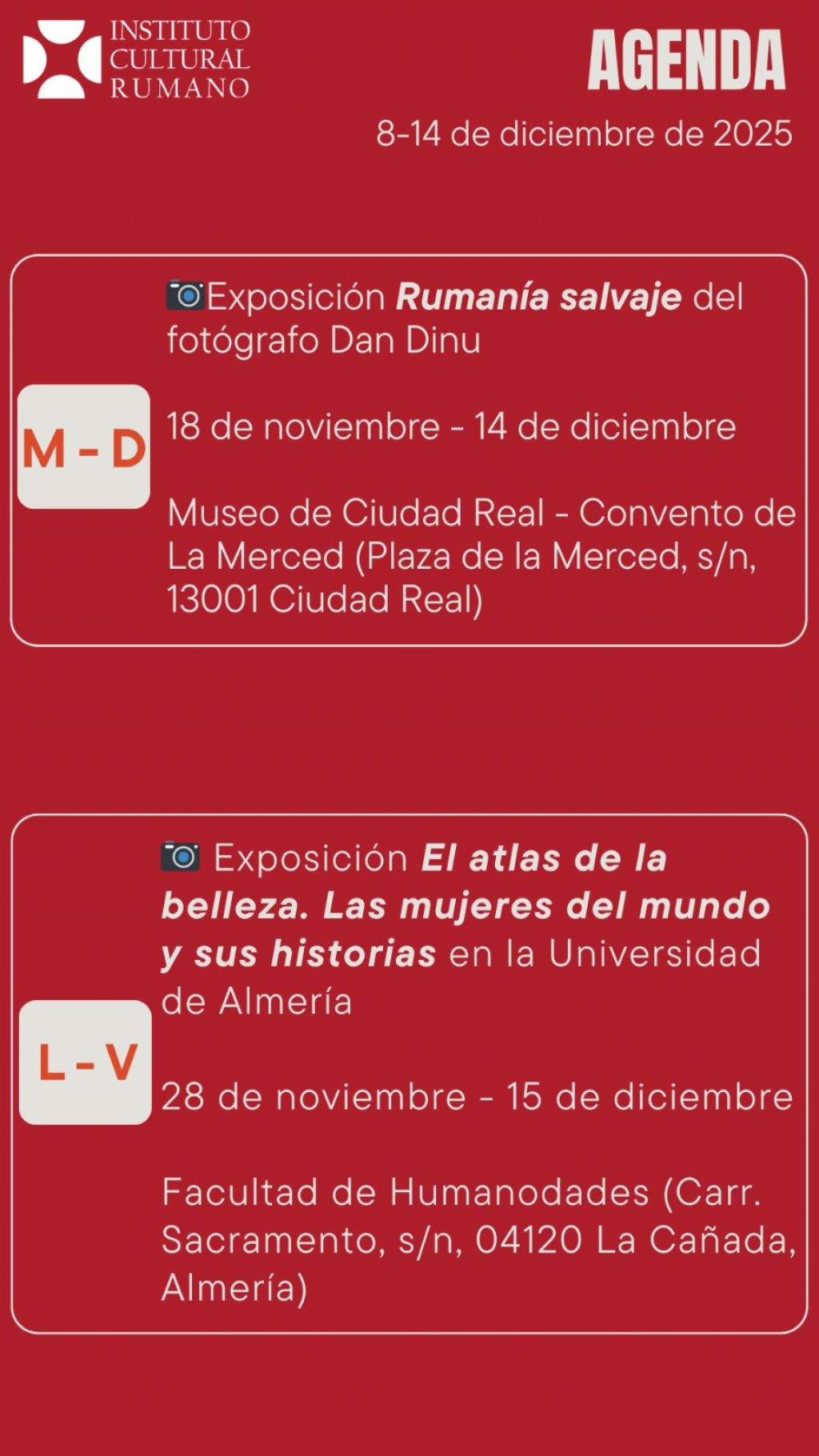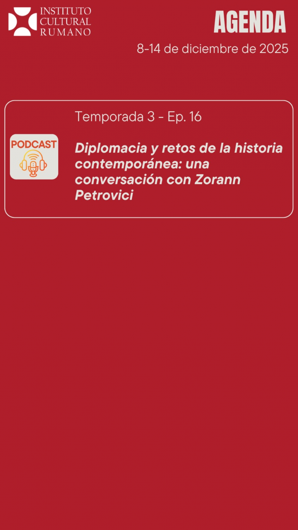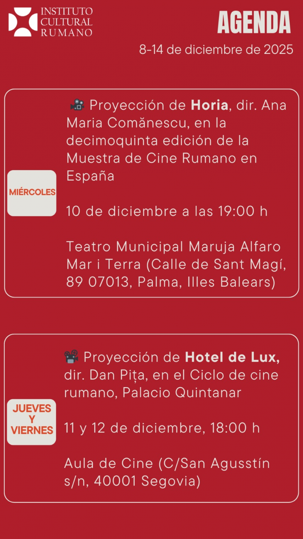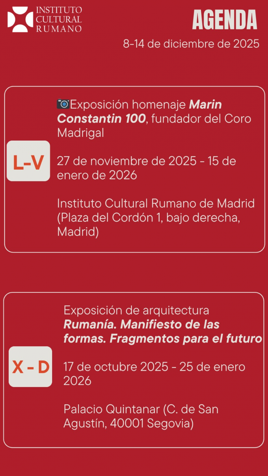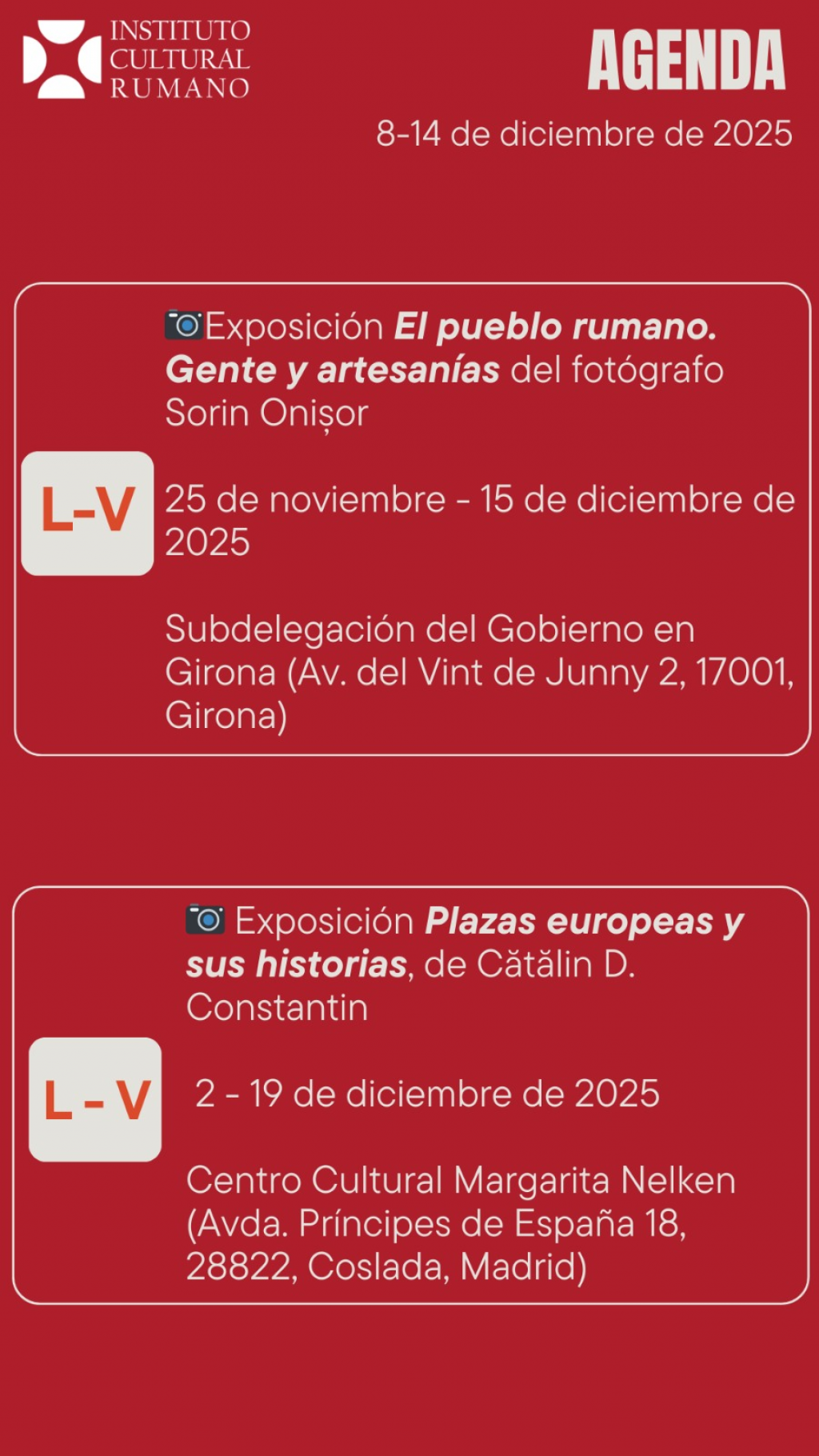 Agenda săptămânală a ICR Madrid, 8 - 14 decembrie 2025