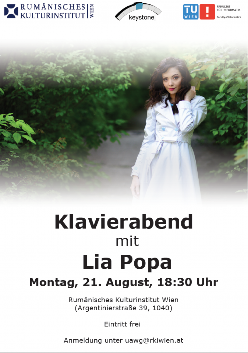 ICR Viena și TU Wien (Universitatea Tehnică din Viena) organizează marți, 21 august 2017, ora 18.30, la sediul Institutului din Argentinierstraße 39, un recital în interpretarea pianistei Lia Popa. Evenimentul continuă seria manifestărilor dedicate pianistului şi compozitorului român Dinu Lipatti, de la naşterea căruia s-au împlinit 100 de ani în 2017.
