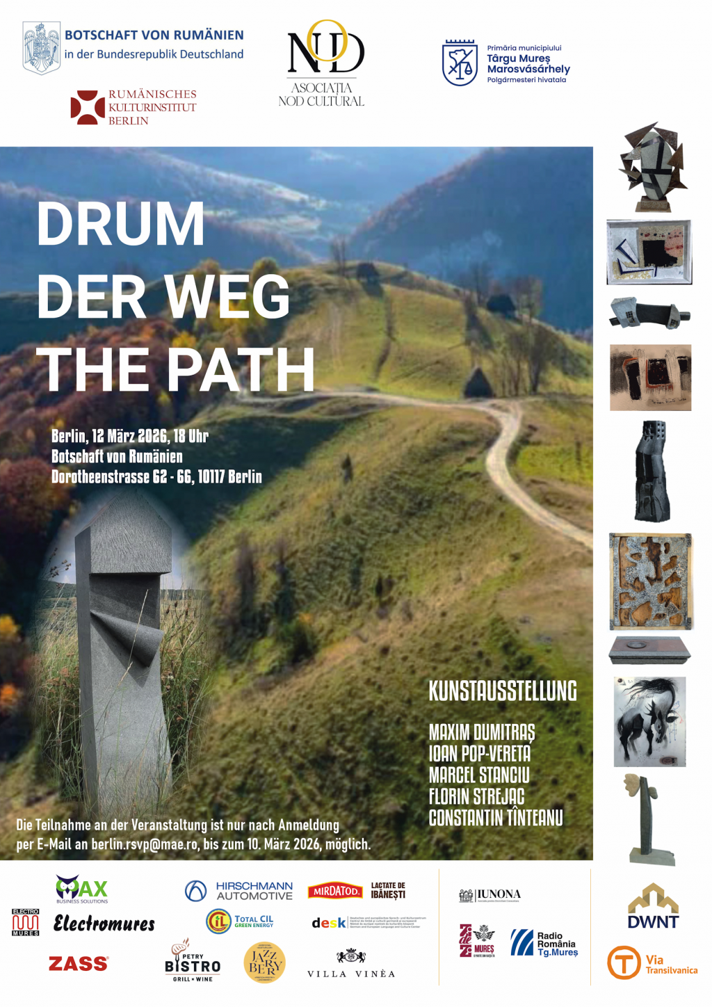Institutul Cultural Român „Titu Maiorescu” din Berlin vă invită la finisajul expoziției „Drum – Der Weg”, organizat de Embassy of Romania in Berlin, care va avea loc joi, 12 martie 2026, de la ora 18:00, la sediul ambasadei (Dorotheenstr. 62–66, 10117 Berlin).