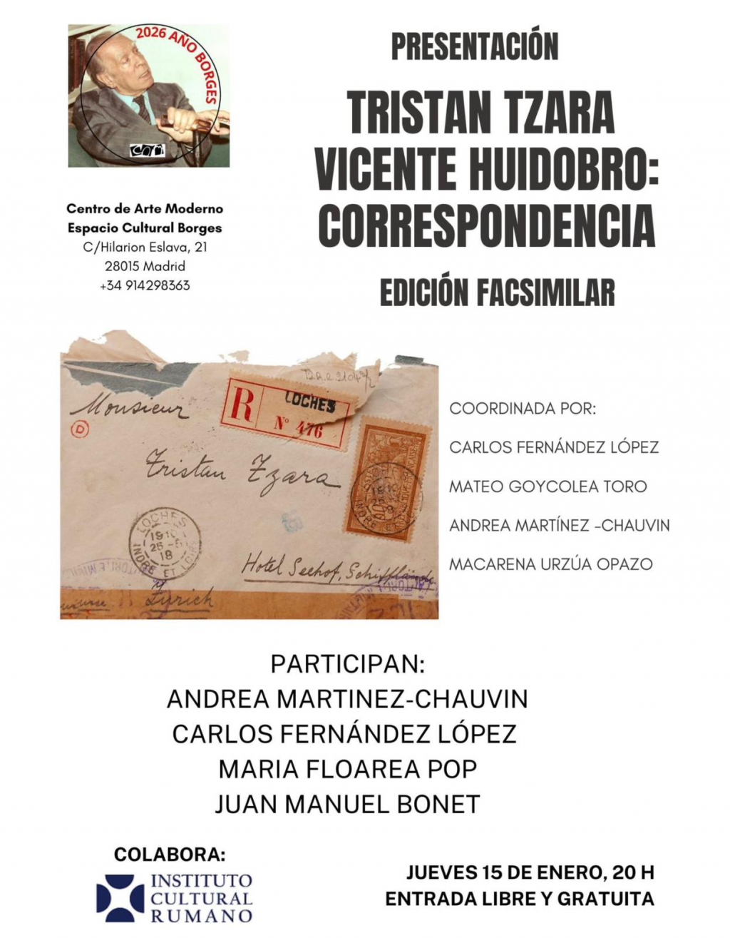 Pe 15 ianuarie 2026, ora 20:00, la Librería del Centro (C/ Hilarión Eslava 21), un spațiu cultural de prestigiu din Madrid, afiliat editorial și instituțional Centrului Cultural Borges din Argentina, va avea loc evenimentul de lansare al volumului „Tristan Tzara și Vicente Huidobro: Corespondență (1918–1927)”, publicat în spaniolă, în 2025 la Del Centro Editores. Ediția facsimil, realizată cu rigoare științifică de către Carlos Fernández López, Mateo Goycolea Toro, Andrea Martínez-Chauvin și Macarena Urzúa Opazo, constituie o sursă de referință pentru cercetarea literară și istoria culturală, facilitând accesul la documente originale și contribuind la conservarea patrimoniului literar internațional.