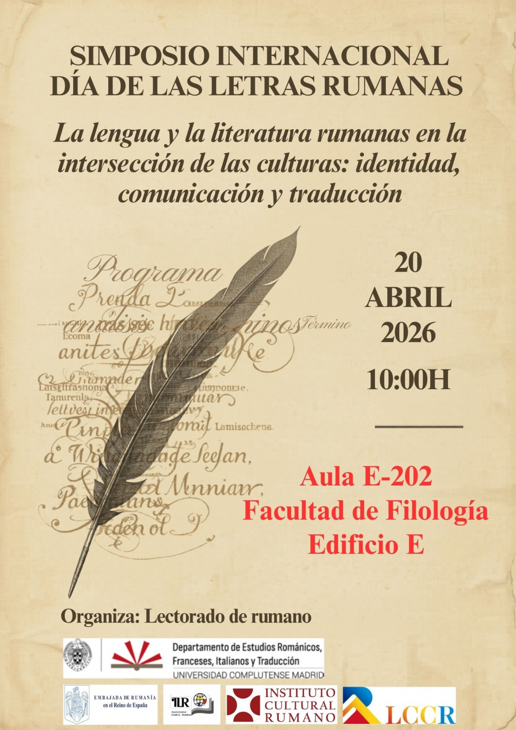 Pe 20 aprilie 2026, la Facultatea de Filologie a Universității Complutense de la Madrid, Edificiul E – Aula E-202, va avea loc Simpozionul Internațional Ziua literelor române – Limba și literatura română la intersecția culturilor: identitate, comunicare și traducere. Simpozionul oferă un cadru de reflecție asupra circulației valorilor literare și artistice românești, analizând modul în care acestea sunt traduse, receptate și reinterpretate în spațiul cultural internațional. Totodată, evenimentul își propune să dezbată noile paradigme în predarea limbii române, atât ca limbă străină, cât și ca limbă maternă, adaptate cerințelor mediului digital și profilului studentului contemporan.