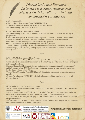 Organizatori: Lectoratul de Limba Română, Departamentul de Studii Romanice, Franceze, Italiene și Traducere de la Universitatea Complutense, Institutul Limbii Române și Institutul Cultural Român de la Madrid, sub auspiciile Ambasadei României în Regatul Spaniei.