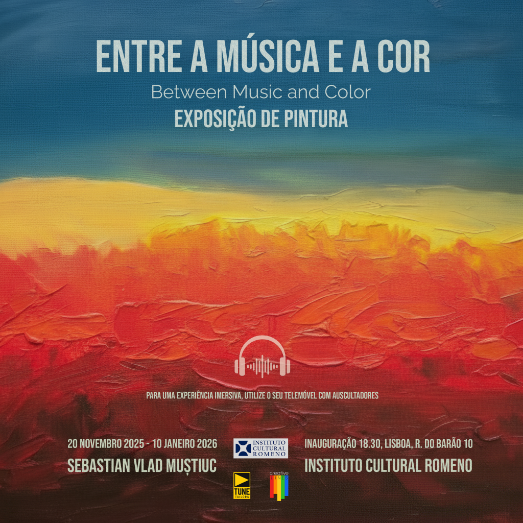 ICR Lisabona găzduiește în perioada 20 noiembrie 2025 – 10 ianuarie 2026 expoziția „Între muzică și culoare” a artistului Sebastian Vlad Muștiuc. Expoziția va fi vernisată în data de 20 noiembrie 2025 începând cu ora 18:30 la sediul ICR Lisabona, Rua do Barao 10.