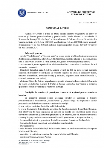 Găsiţi informaţii complete pe site-ul Agenţiei de Credite şi Burse de Studii la pagina: https://roburse.ro/burse-de-studii/bursa-v-parvan-si-n-iorga/
