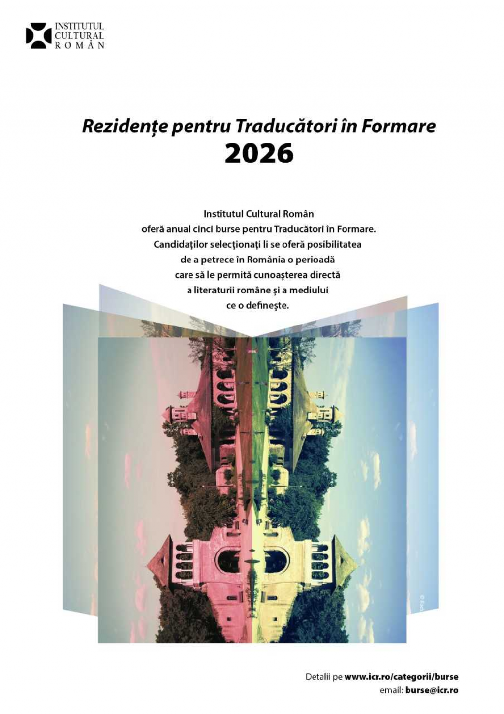 Institutul Cultural Român lansează un apel la candidaturi pentru a oferi în anul 2026 cinci rezidenţe pentru traducători în formare. Invităm candidații interesați să trimită dosarele de candidatură până pe data de 14 mai 2026, ora 16:00, ora României, la adresa de e-mail bursarezidente@icr.ro.