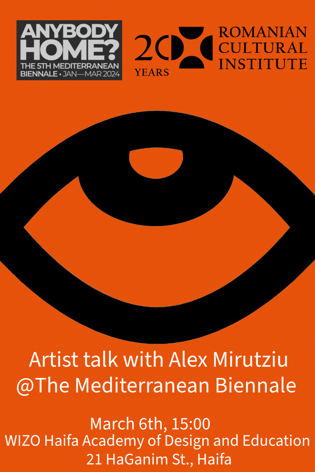 Doi artiști plastici din România – Alex Mirutziu și Ciprian Mureșan – participă la ediția 2024 a Bienalei Mediteranei, care are loc în perioada ianuarie – martie, la Haifa. În cadrul programului internațional, aceștia sunt prezenți cu lucrările Dog Luv, 2009 (Ciprian Mureșan) și Tears are precious, 2007 (Alex Mirutziu). Acesta din urmă este prezent în Israel, cu sprijinul ICR Tel Aviv, pentru a susține un atelier de creație în data de 5 martie și o prelegere cu titlul “Edgingtology - an introduction” pe 6 martie, la Wizo Haifa Academy of Design and Education din Haifa. Ediția curentă a Bienalei, cu numărul cinci și având titlul Anybody home?, se desfășoară cu participarea artiștilor vizuali contemporani din Israel și din străinătate.