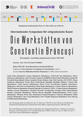 Institutul Cultural Român de la Viena, în parteneriat cu Centrul de Cercetare, Documentare și Promovare „Constantin Brâncuși" din Târgu Jiu, Uniunea Artiștilor Plastici din România și Facultatea de Teologie Ortodoxă – secția Arte, din cadrul Universității din Craiova organizează marți, 25 martie 2026, ora 19.00, la vernisajul expoziției „Atelierele Constantin Brâncuși", un proiect expozițional dedicat artei contemporane românești și internaționale, în contextul Anului Național Constantin Brâncuși.