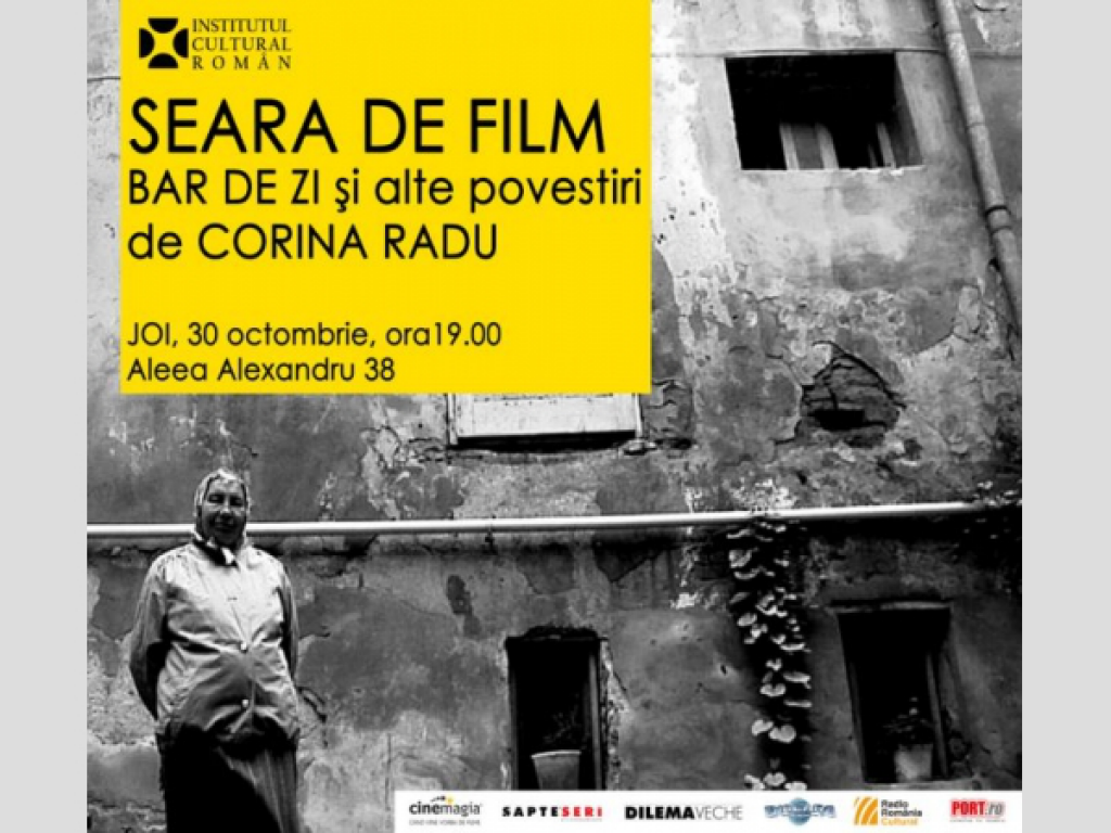 La sfârşitul acestei luni, bucureştenii cinefili sunt invitaţi la Institutul Cultural Român să-i cunoască pe clienţii ultimului bar de zi din Sibiu rămas în proprietatea statului. Joi, 30 octombrie 2008, de la ora 19, la Seara de film de la ICR (Aleea Alexandru nr. 38), regizoarea Corina Radu exploreaza, în documentarul BAR DE ZI şi alte povestiri, istoriile unor oameni obişnuiţi, ale unor locuri comune, ale unor zile ca oricare altele. În spatele unei aparente banalităţi, sunt descoperite poveşti de viaţă dramatice, neaşteptate, destine împlinite, idealuri uitate. Personajele, alese la întâmplare din bar şi urmărite până în spaţiile lor private, dovedesc o sensibilitate şi o forţă suprinzatoare şi impresionează prin reflecţii insolite. Filmul i-a adus autoarei Premiul pentru cel mai bun regizor de film documentar la Festivalul de Film Dakino şi a fost distins cu Premiul pentru cel mai bun film românesc la Festivalul de Film ASTRA, Sibiu (2007), precum şi cu Marele Premiu la secţiunea cadRO a Festivalului de Film Cronograf de la Chişinău (2008). BAR DE ZI şi alte povestiri este debutul în film documentar de lung metraj al Corinei Radu. În prezent, regizoarea lucrează la proiectul documentar intitulat A matter of heart. Queen Maria of Romania.