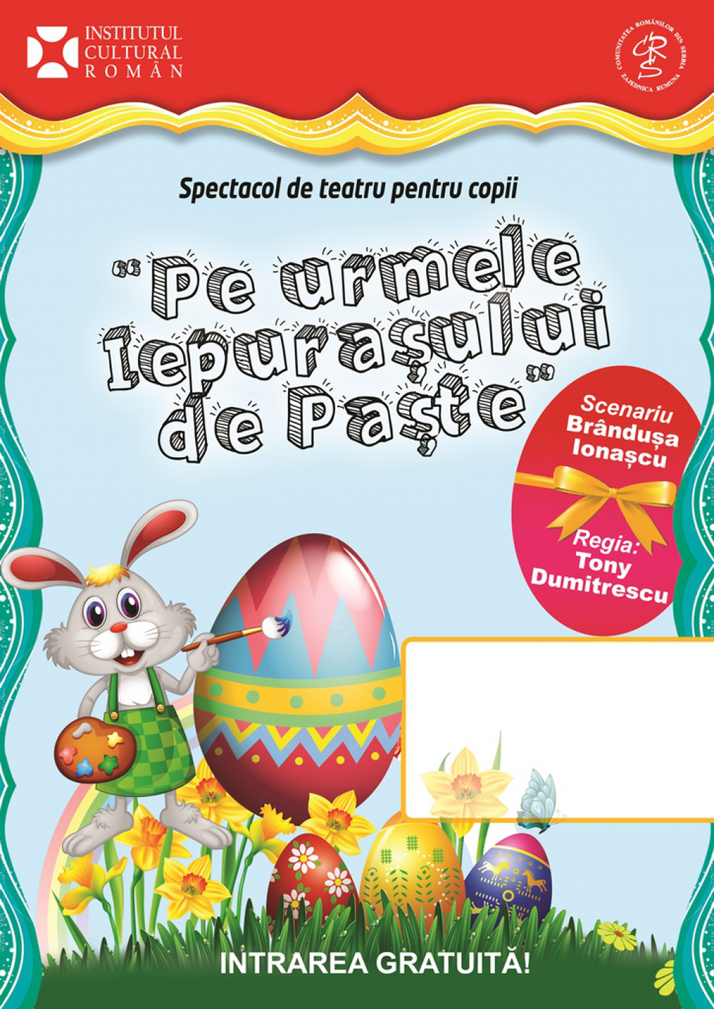 Spectacolul Pe urmele iepurașului de Paște, pe un scenariul semnat de Brândușa Ionașcu, în regia lui Tony Dumitrescu, este proiect independent realizat de actori profesioniști din București.