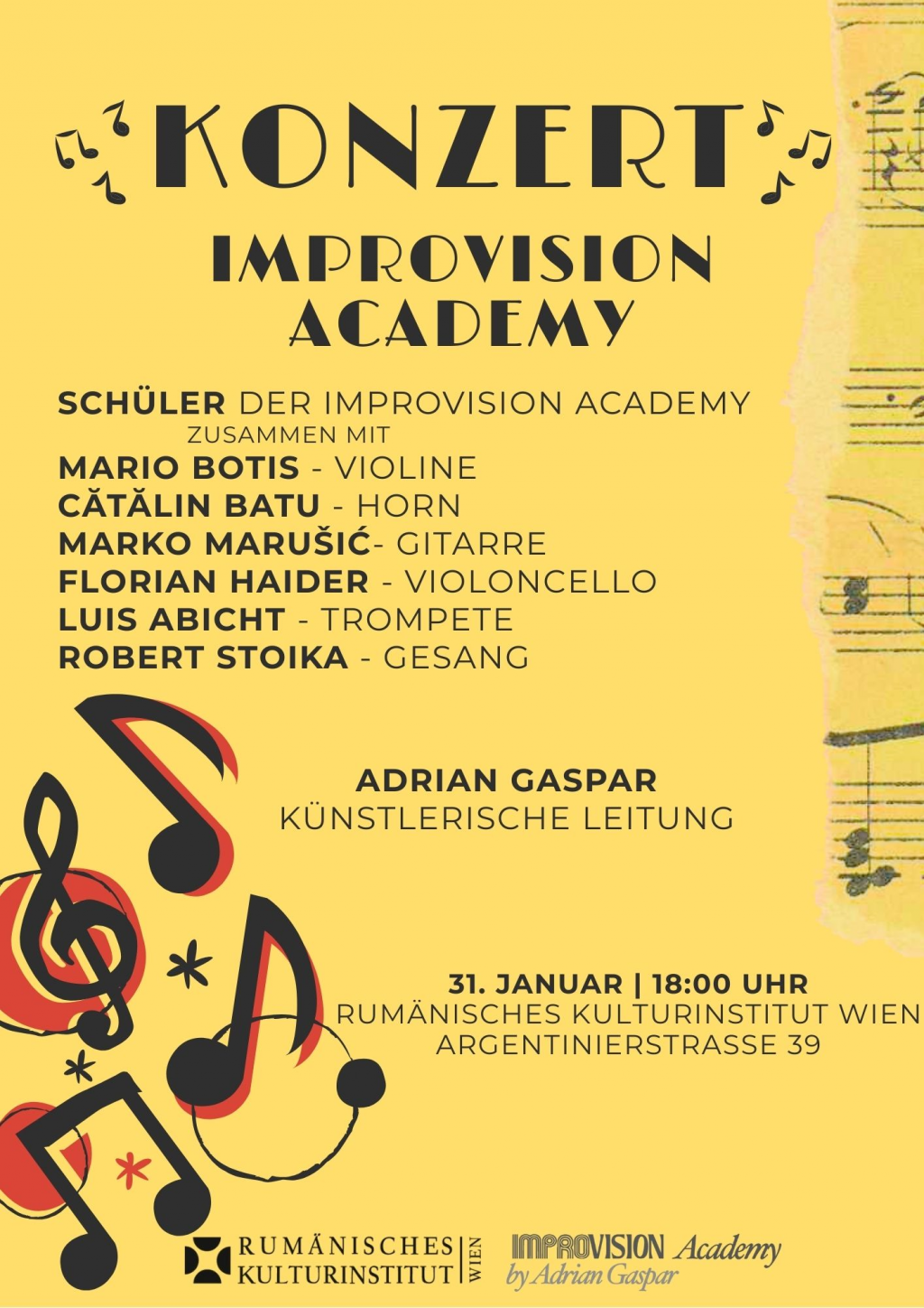 Institutul Cultural Român de la Viena găzduiește sâmbătă, 31 ianuarie 2026, de la ora 18.00, concertul Improvision Academy, un eveniment educativ și artistic ce reunește pe aceeași scenă elevi cu vârste între 3 și 18 ani și muzicieni profesioniști activi pe scena vieneză, într-un program care îmbină muzica clasică, creația contemporană, jazz, pop, rock, indie și world music, inclusiv piese inspirate din repertoriul balcanic.