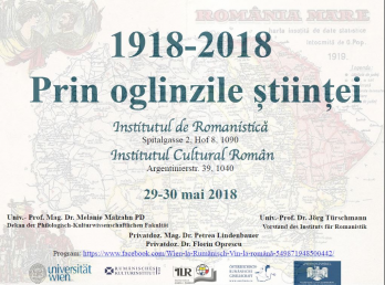 Institutul Cultural Român de la Viena şi Institutul de Romanistică al Universității din Viena găzduiesc în zilele de 29 şi 30 mai conferința ştiinţifică intitulată „1918-2018. Prin oglinzile științei“, dedicată Centenarului Marii Uniri. Colocviul îşi propune să analizeze importanța celor 100 de ani de istorie, domeniile ştiinţifice avute în vedere fiind: istorie, psihosociologie, economie istorică, juridic, istoria mentalităților, lingvistică și literatură. În acest scop sunt invitaţi specialiști care surprind din perspectiva domeniilor de expertiză și analizează comparativ anii 1918 și 2018.