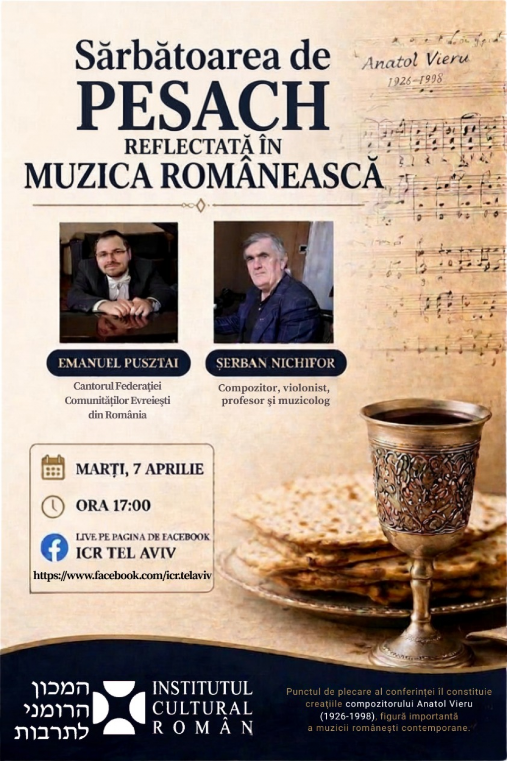 În contextul sărbătorii de Pesach („Paștele evreiesc”), celebrată în perioada 1-8 aprilie, precum și al apropierii sărbătorilor pascale creștine, ICR Tel Aviv organizează, în data de 7 aprilie 2026, începând cu ora 17:00, conferința online intitulată „Sărbătoarea de Pesach reflectată în muzica românească”.