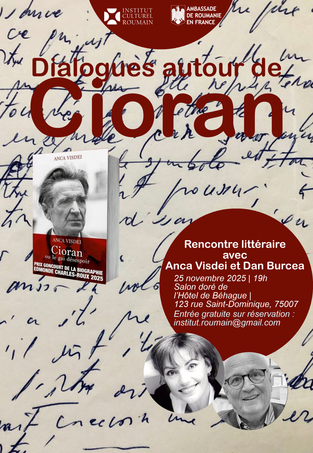 Cette rencontre aura pour protagonistes Anca Visdei, écrivaine et essayiste, dont le dernier livre Cioran ou le gai désespoir, L’Archipel (2025), a obtenu le prestigieux Goncourt de la biographie Edmonde Charles-Roux, et Dan Burcea, traducteur, journaliste et critique littéraire.