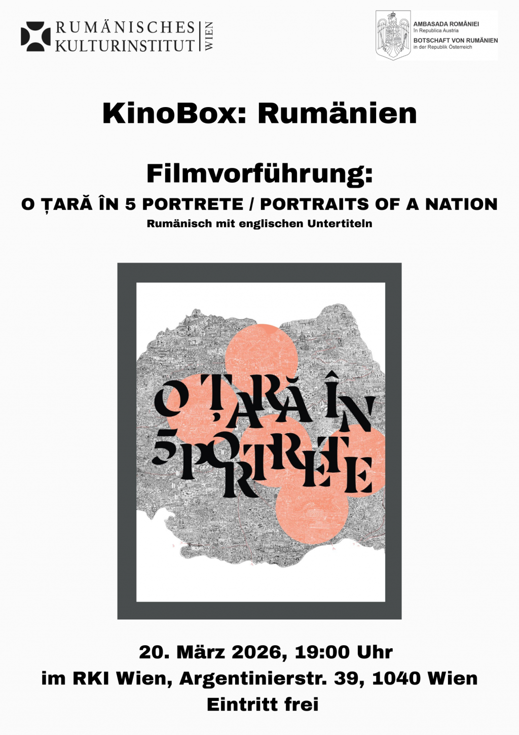 Institutul Cultural Român de la Viena, în parteneriat cu Ambasada României în Republica Austria, inaugurează vineri, 20 martie 2026, proiectul cultural „KinoBox: Rumänien“, dedicat promovării cinematografiei românești contemporane, constând într-o serie de proiecții desfășurate lunar la sediul reprezentanței pe parcursul anului 2026. Cu ocazia Zilei Internaționale a Francofoniei, de la ora 19:00, va fi proiectat documentarul O țară în 5 portrete, r. Andrei-Nicolae Teodorescu.