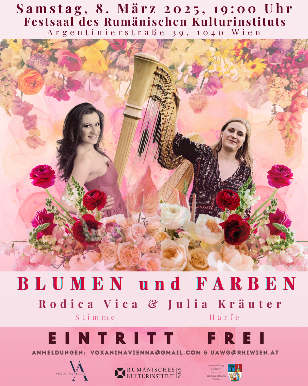 Cel de-al doilea eveniment, organizat în parteneriat cu Asociația Vox Anima din Viena, începe la ora 19.00. Concertul „Flori și culori” le aduce în prim plan pe soprana Rodica Vica și pe harpista Julia Kräuter. Concertul este împărțit în trei secțiuni tematice: prima secțiune este dedicată poeziei naturii, un simbol al fertilității și creativității, a doua emoțiilor feminine și romantismului, iar a treia este despre forța emoțională a femeilor.