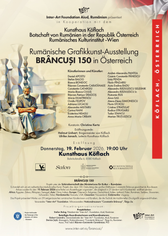 Fundația „Inter-Art” Aiud, Muzeul Național „Constantin Brâncuși” Târgu Jiu și Kunsthaus Köflach organizează, cu sprijinul Institutului Cultural Român de la Viena și al Ambasadei României în Republica Austria, în perioada 19-27 februarie 2026, expoziția de artă grafică românească „BRÂNCUȘI 150”, la Kunsthaus Köflach, spațiu expozițional de prestigiu. Vernisajul va avea loc joi, 19 februarie 2026, de la ora 19:00. Curator: Christine Kertz.