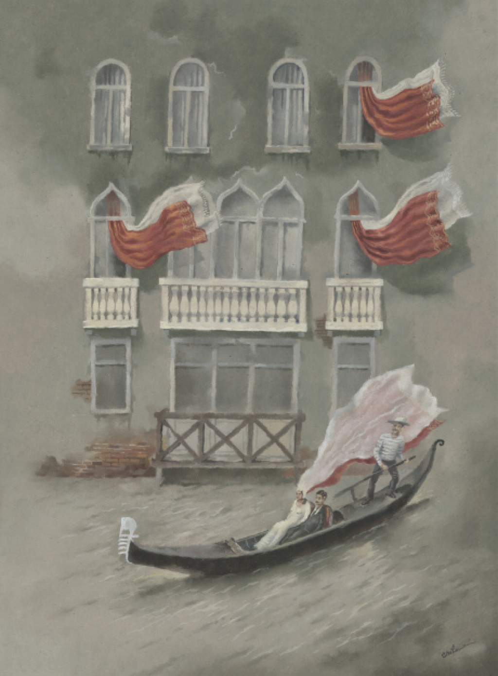 Expoziţia pictorului şi graficianului Florian Doru Crihană cuprinde acuarele şi picturi executate în ulei pe carton realizate în perioada 2015–2017, o sugestivă selecţie tematică de lucrări care abordează teme de actualitate interpretate în cheie satirică, prin recurgerea la o fină ironie ce utilizează elemente de istorie şi tradiţie pentru a înfăţişa cotidianitatea şi pitorescul societăţii actuale, în dinamica specifică acesteia în secolele XX–XXI. Seria de tablouri conţine reprezentări suprarealiste realizate în urma studiilor din ultimii ani asupra oraşului Veneţia, dar şi a vizitelor prilejuite de căutarea filonului de inspiraţie. Artistul a urmărit să evidenţieze aspectele mai puţin cunoscute din viaţa oraşului, precum şi unele elemente insolite şi de actualitate. Având ca personaje principale «Mirele şi Mireasa», tablourile poartă privitorul prin poveştile Veneţiei, răstălmăcite într-o cheie umoristică. Astfel apar «Legenda construcţiei Podului Rialto» sau confiscarea picturii «Nuntă la Cana» de către Napoleon Bonaparte. Compoziţiile înfăţişează şi edificii istorice binecunoscute precum «Turnul Orologiului», «Palatul Dogilor», «Puntea Suspinelor», «Il Campanile» etc. Cu prilejul realizării acestei serii de lucrări, artistul a studiat bisericile din Veneţia şi a executat câteva picturi cu cele care au câte o poveste mai cunoscută, precum Biserica Santa Maria della Salute şi Biserica Madonna dell’Orto. Veneţia este pentru artist un punct «fierbinte» al continentului, un tărâm de inspiraţie de la care pictorul poate porni spre a ajunge până în contemporaneitate, la temele de actualitate din Europa noastră cea de toate zilele.