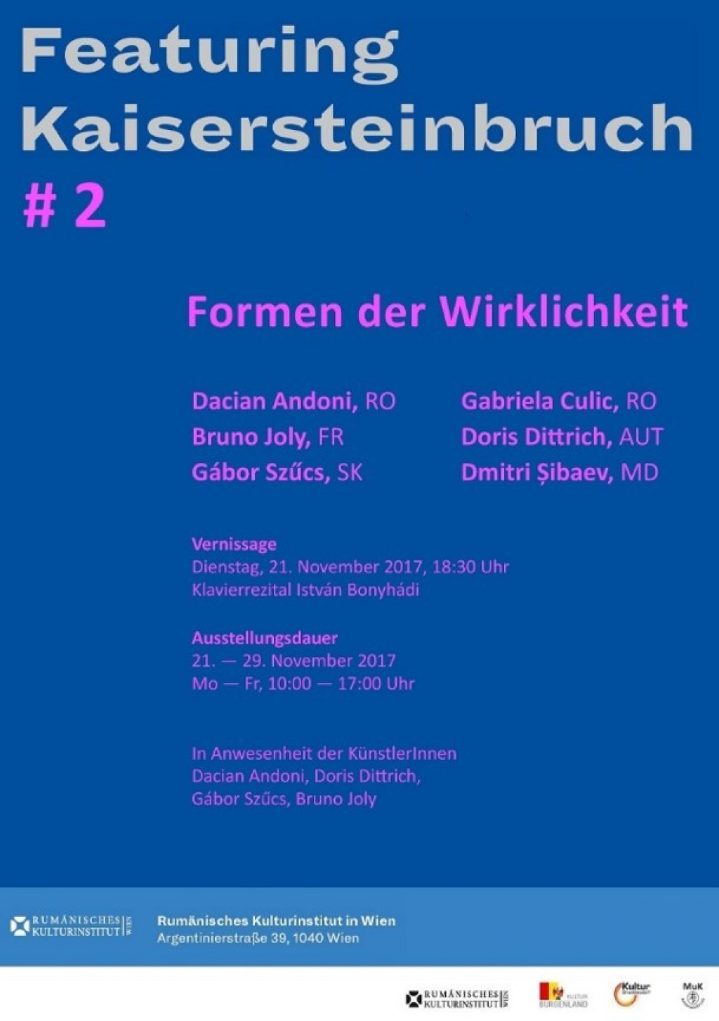 În perioada 21-29 noiembrie Galeria ICR Viena prezintă expoziţia „Formele realităţii # 2“/ „Formen der Wirklichkeit # 2“, care reuneşte lucrări realizate de artiştii internaţionali Dacian Andoni (România), Gabriela Culic (România), Dmitri Şibaev (Republica Moldova), Doris Dittrich (Austria), Bruno Joly (Franța) și Gábor Szűcs (Slovacia). Lucrările sunt rezultatul participării la ediţia 2017 a simpozionului „Formele realităţii # 2“, organizat în perioada 8-17 septembrie de Museums- und Kulturverein Kaisersteinbruch (MuK) / Muzeul și Asociația Culturală Kaisersteinbruch în colaborare cu Institutul Cultural Român de la Viena.