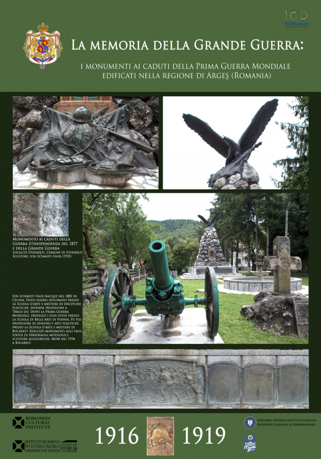 Luni, 19 martie 2018, la ora 17,30, în Noua Galerie a Institutului Român de Cultură şi Cercetare Umanistică de la Veneţia, instituţia românească din oraşul istoric italian va organiza vernisajul expoziţiei istorico–documentare «La memoria della Grande Guerra: i monumenti ai caduti della Prima Guerra Mondiale edificati nella Regione di Argeş (Romania)» organizată – sub patronajul Ambasadei României în Italia – de Institutul Român de Cultură şi Cercetare Umanistică de la Veneţia în parteneriat cu Institutul Naţional al Patrimoniului din Bucureşti şi Muzeul Judeţean Argeş din Piteşti, beneficiind de susţinerea Institutului Cultual Român. În deschiderea expoziţiei, care se va afla la dispoziţia publicului în perioada 19 martie–2 aprilie 2018, de marţea până duminica, în intervalul orar 10,30–13,30 şi 15,30–19,30, vor susţine alocuţiuni Prof. univ. dr. Cristian Luca (Directorul adjunct al Institutului Român de Cultură şi Cercetare Umanistică de la Veneţia), Dr. Daniela Mihai (Director de programe al Institutului Naţional al Patrimoniului din Bucureşti) şi Lector univ. dr. Cornel Popescu (Managerul general al Muzeului Judeţean Argeş din Piteşti).