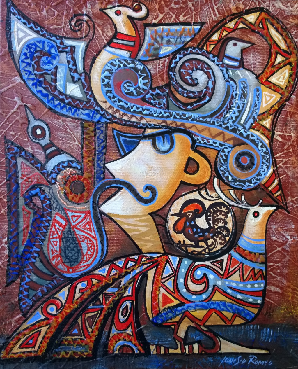 Lucrările din cadrul expoziţiei sunt transpuneri şi interpretări libere ale acestor elemente de decor neolitic, filtrate şi reinterpretate de sensibilitatea estetică a artistului, multe dintre acestea purtând vizitatorul cu gândul la arta populară românească. Aceste reflexii sunt percepute şi prin temele alese de artist pentru lucrările sale. Picturile ce constituie această expoziţie sunt o abordare plastică a oniricului, fantasticului, mitului, a poveştilor sau legendelor, împletite dezinvolt cu interogările emotive ale personajelor înfăţişate de artist. Este o întoarcere la temele provocatoare , la retorică şi dialog, la redescoperirea compoziţiei clasice în care «jocul» contrastelor sau al binomului «gol–plin» se succed involuntar, dar armonios elaborate, unde umbra formelor imaginate construieşte un întreg echilibrat, lăsând să se perceapă figurativul susţinut cromatic şi structural.