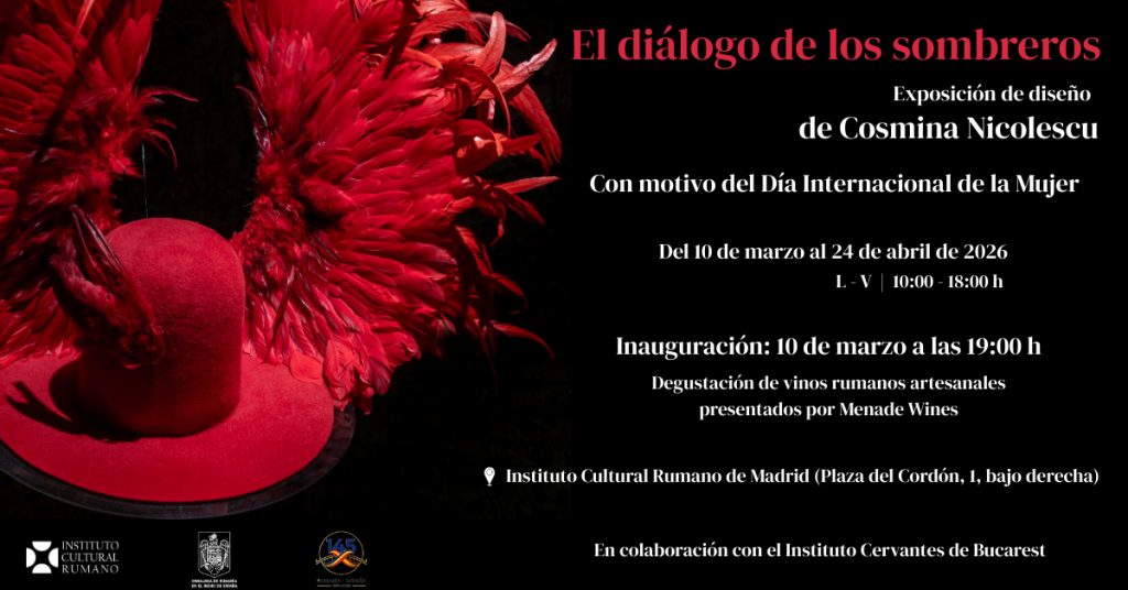 Cu ocazia Zilei Femeii, Institutul Cultural Român din Madrid, sub auspiciile Ambasadei României în Regatul Spaniei, în colaborare cu Institutul Cervantes din București, prezintă expoziția de pălării „Povești sub pălării: eleganța și farmecul în 16 portrete de femei din România și Spania” de Cosmina Nicolescu.